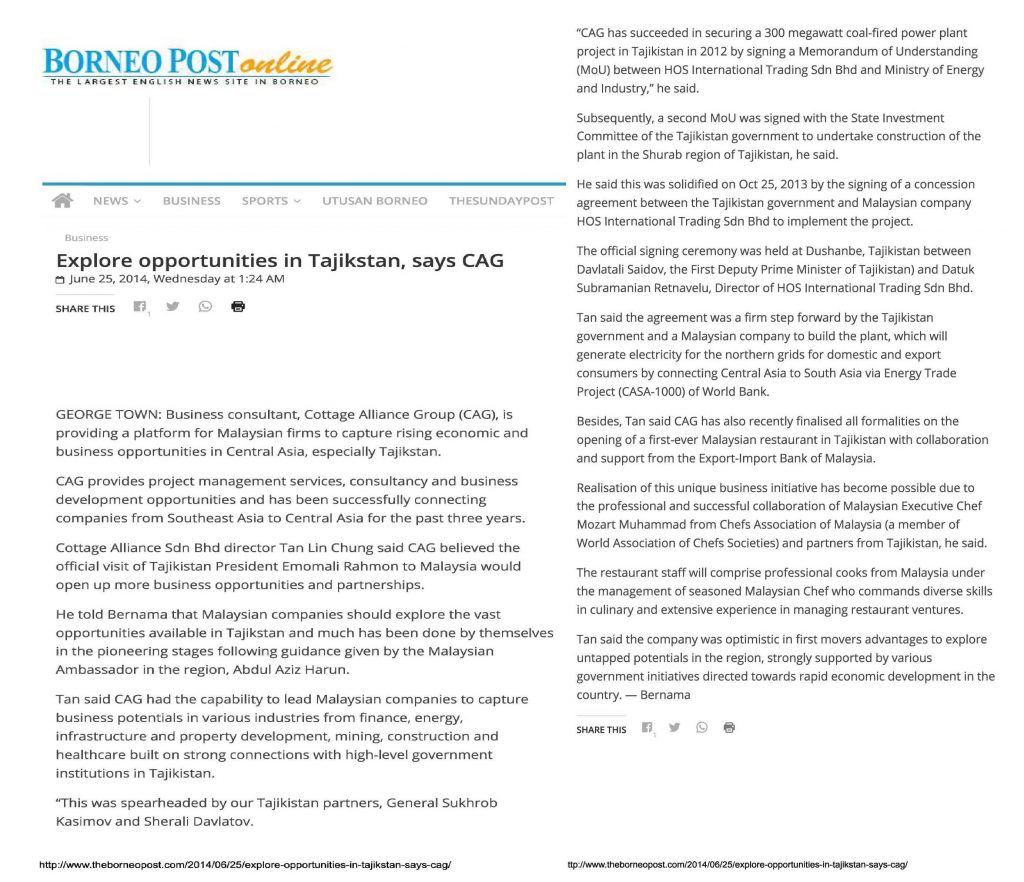 On June 26, 2014, CAG has assisted and participated in bilateral relationship and first official visit of the President of Tajikistan, His Excellency Mr. President Emomalii Rahmon together with his wife to Malaysia at the invitation of Yang di-Pertuan Agong Tuanku Abdul Halim Mu’adzam Shah.